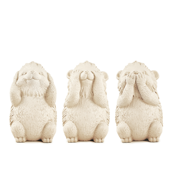 Produzido em cimento, este kit vem com três peças com design diferenciado em forma de porco espinho. Um tapando os olhos, outro os ouvidos e o terceiro a boca. Perfeito para decorar seu escritório, sala, cozinha, área gourmet e muito mais com muita energia positiva! e, de uma forma divertida, faz referência a sabedoria do provérbio japonês: “Não ver o mal, não ouvir o mal, não falar o mal”. Muito inspirador, não? Tudo o que você poderia querer!