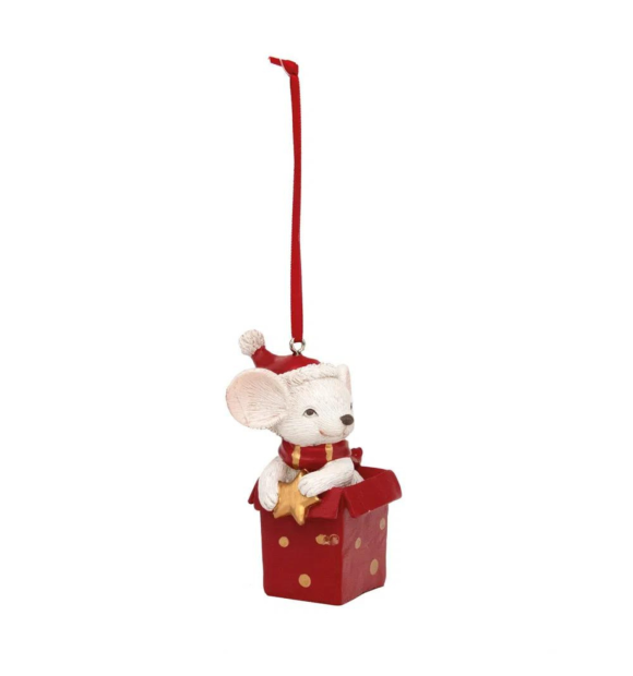 Enfeite para Pendurar Rato Noel dentro da Caixa Presente Decorativo de Resina