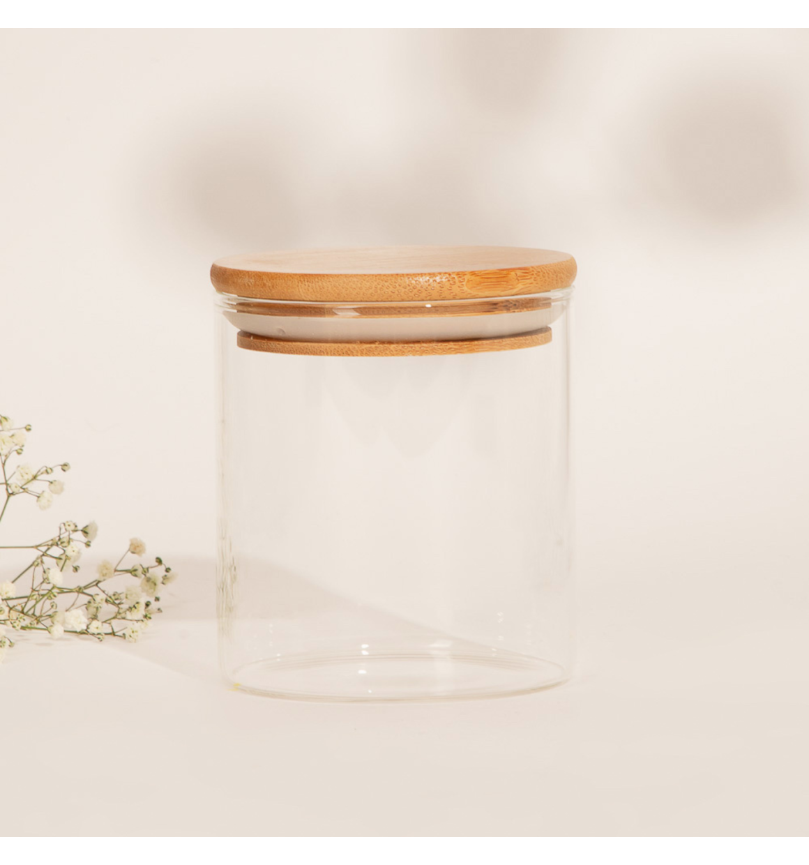 além de ter uma beleza natural da combinação vidro e bambu, esse pote tem em sua tampa um anel de silicone que garante uma vedação total - conservando os alimentos por mais tempo.