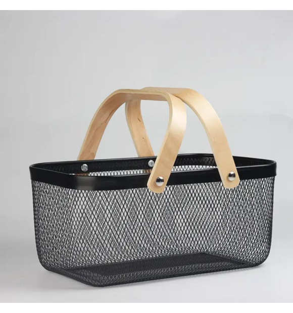 Cesta /Fruteira Preta de Metal com Alça de Madeira - (G)