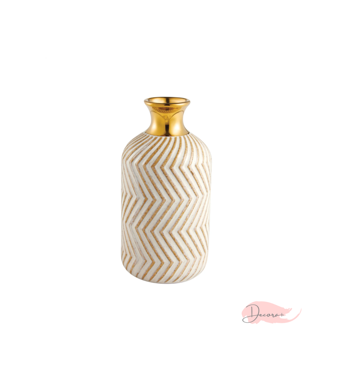 O Vaso de Cerâmica Chevron Creme e Dourado é autêntico, com design único, que agrega muita personalidade à decoração. Ideal para decorar diversos ambientes como sala de estar, jantar, dormitório, cozinha, hall de entrada, escritório, ou até mesmo lavabo. Pode ser usada com ou sem flores, transformando o ambiente com um toque moderno e estiloso.