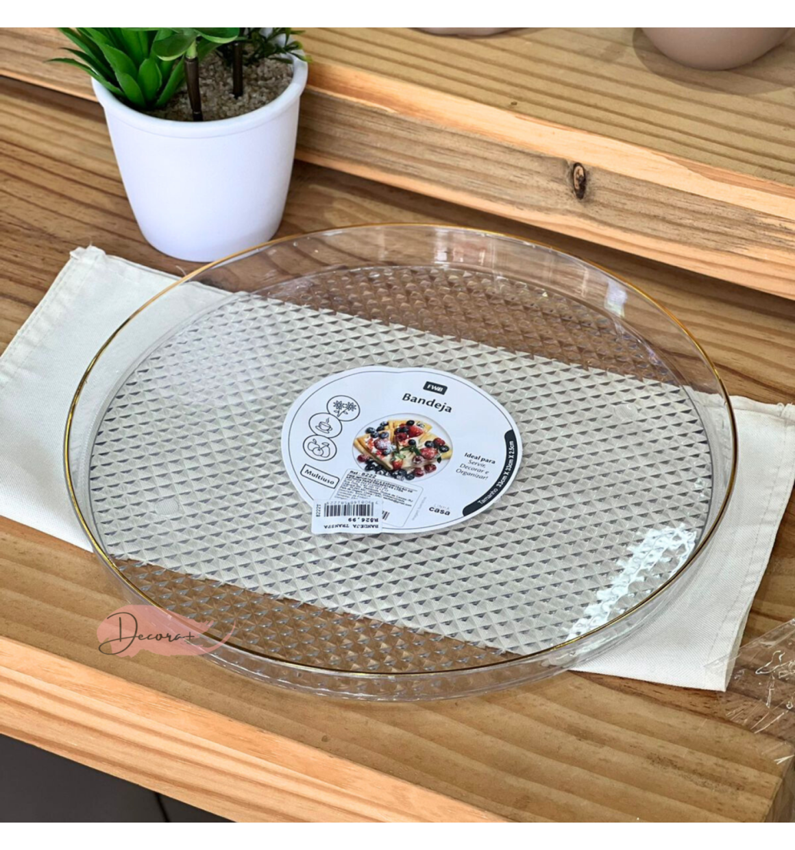 Eleve o seu senso de estilo com esta bandeja única. Compre a Bandeja Transparente Redonda com borda Dourada (G) hoje e faça uma declaração de elegância