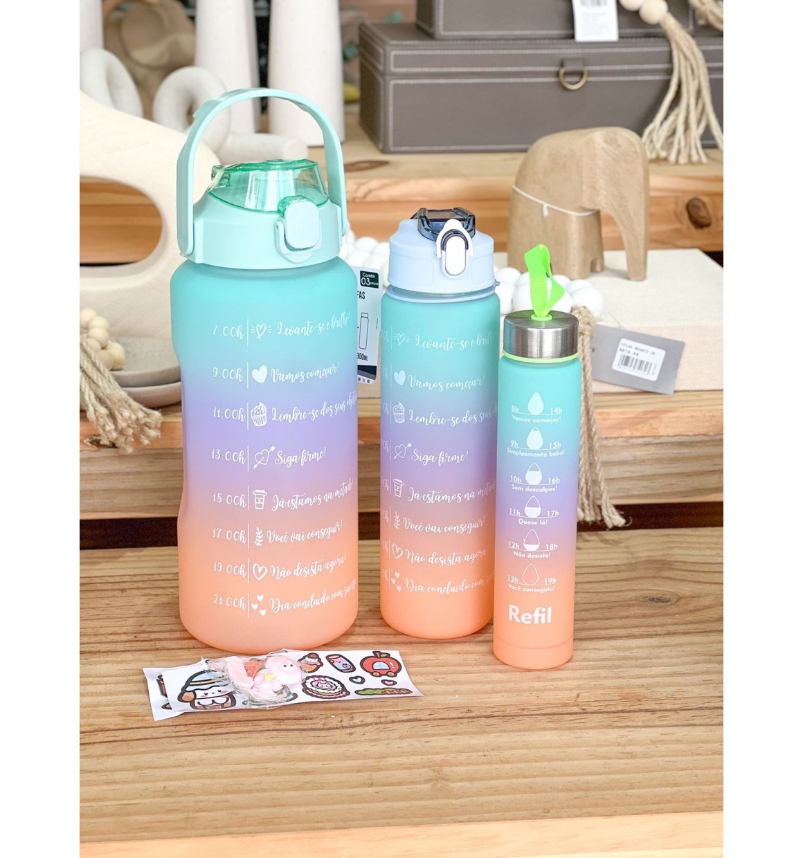 Três Tamanhos, Três Possibilidades: O kit inclui três garrafas com diferentes capacidades - 2L, 750ml e 300ml - para atender todas as suas necessidades de hidratação ao longo do dia.