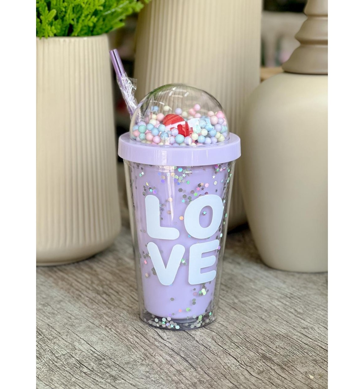 Copo de Plástico com Canudo Lilás - Love 450ml