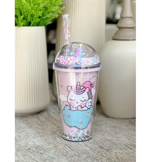 Copo Unicórnio de Plástico com Canudo Mod.1 Rosa Claro - 450ml