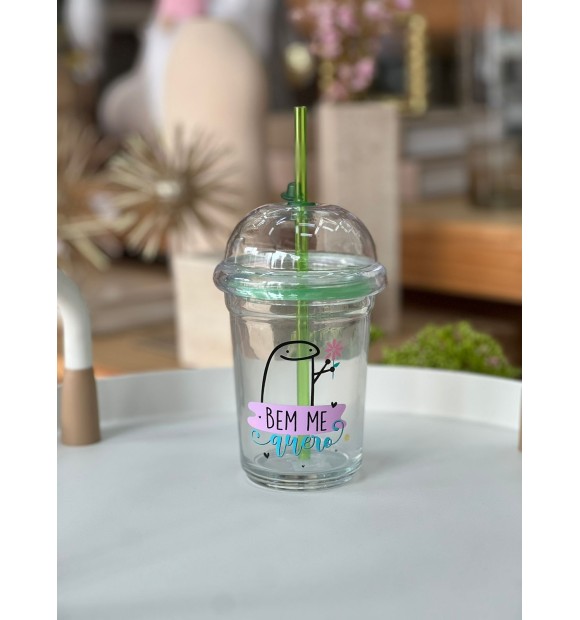 Copo de Vidro c/Tampa Domo e Canudo "Bem me Quero" Verde - 330ml
